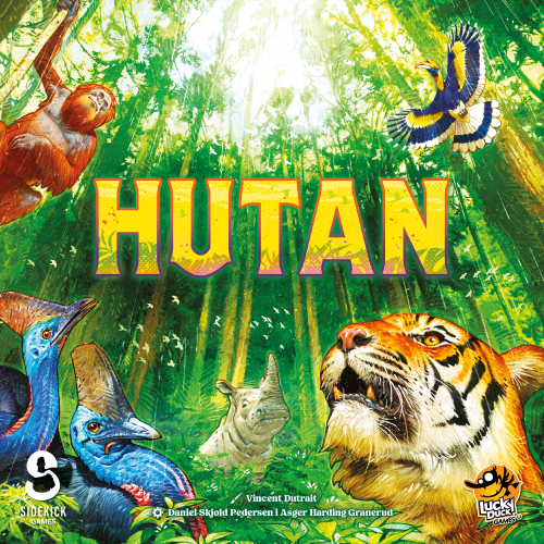 Hutan / Asger Harding Granerud, Daniel Skjold Pedersen; ilustracje: Vincent Dutrait. - Kraków : Lucky Duck Games , 2025. - 1 pudełko (16 plansz lasu, 130 żetonów kwiatów, 64 kartonowe drzewa, 15 drewnianych zwierząt, 1 żeton łuskowca, 70 kart kwiatów, 24 karty ekosystemów, 1 notes punktacji) ; 26x26x7 cm.